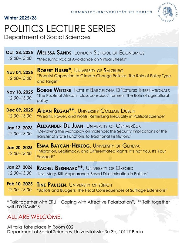Humboldt-Universität zu Berlin | Institut für Sozialwissenschaften | Politisches Verhalten im Vergleich | Lecture Series Politics Lecture Series - WiSe 2025/26 Im Rahmen unserer Politics Lecture Series im Witnersemester 2025/26 freuen wir uns auf folgende Vorträge: